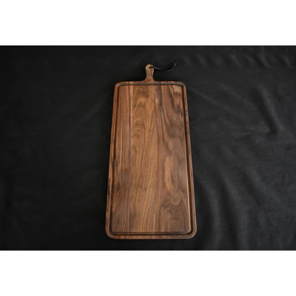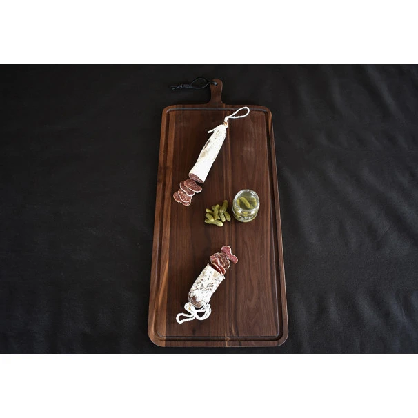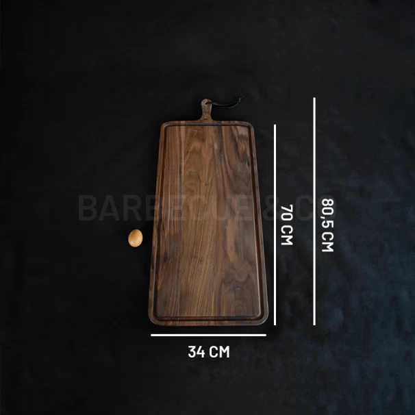 Cette planche à découper a été constitué en noyer massif et finit à l’huile de pépins de raisin. Elle est à la fois élégante et solide.